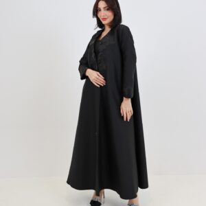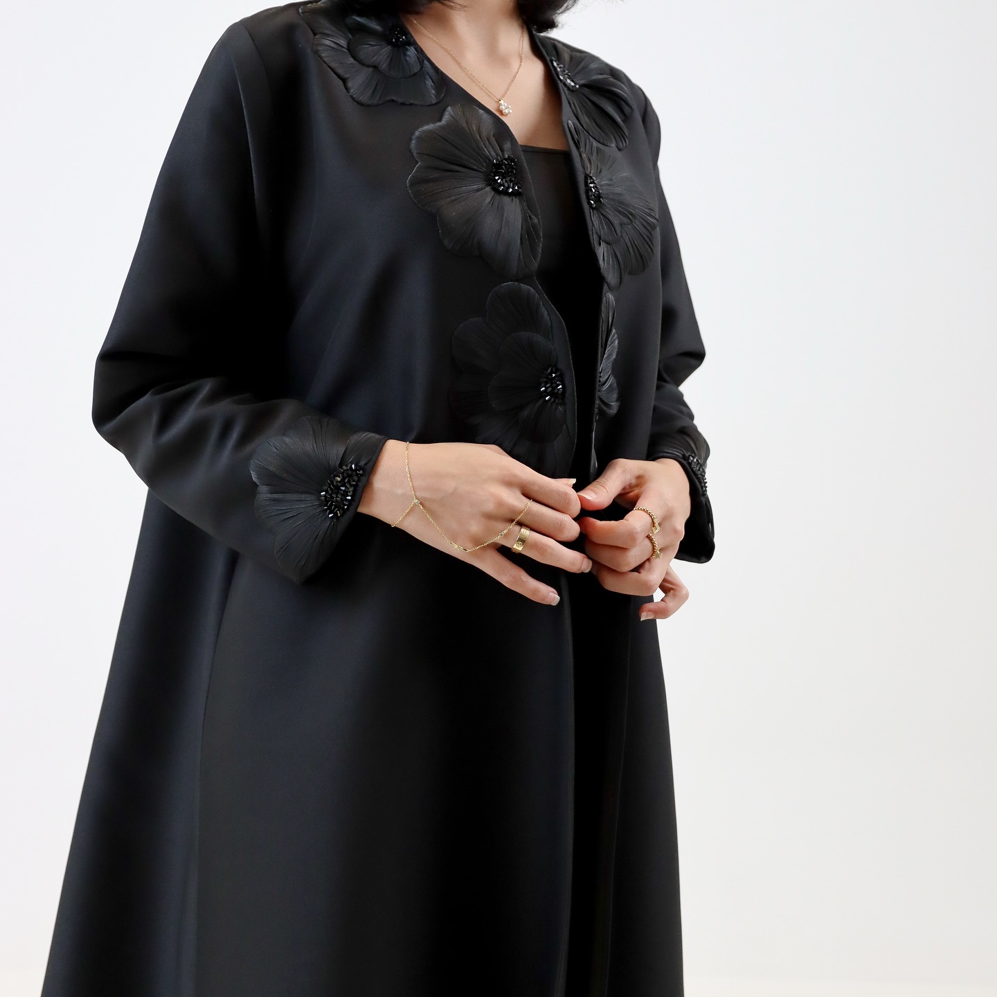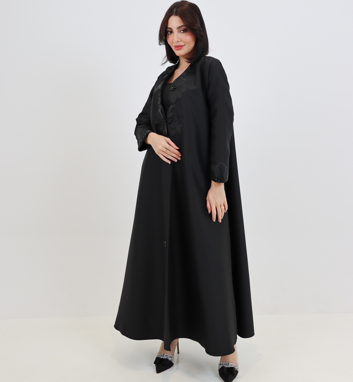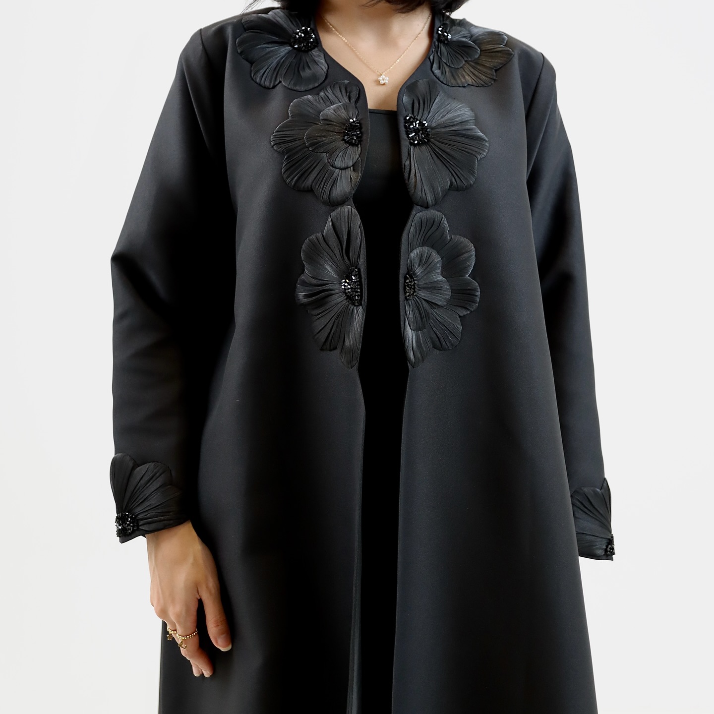عباية A10 من Elegance Heus… ورود ثلاثية الأبعاد بتفاصيل فاخرة تزيّن الصدر والأكمام بلمسة سوداء أنيقة وراقية. تصميم مفتوح يجمع بين الفخامة والراحة، مثالي للمناسبات الخاصة والإطلالات اليومية المميزة.