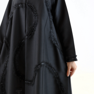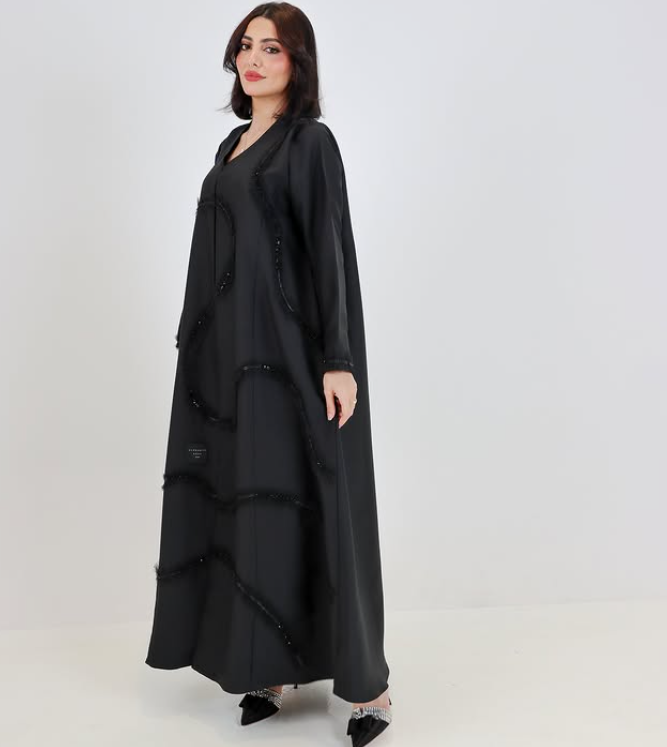 تصميم فخم باللون الأسود مزين بخطوط من الشراشيب الناعمة وتطريزات خرز لامعة تتناغم بانسيابية. خيار مثالي لإطلالة تجمع بين التميز والرقي.