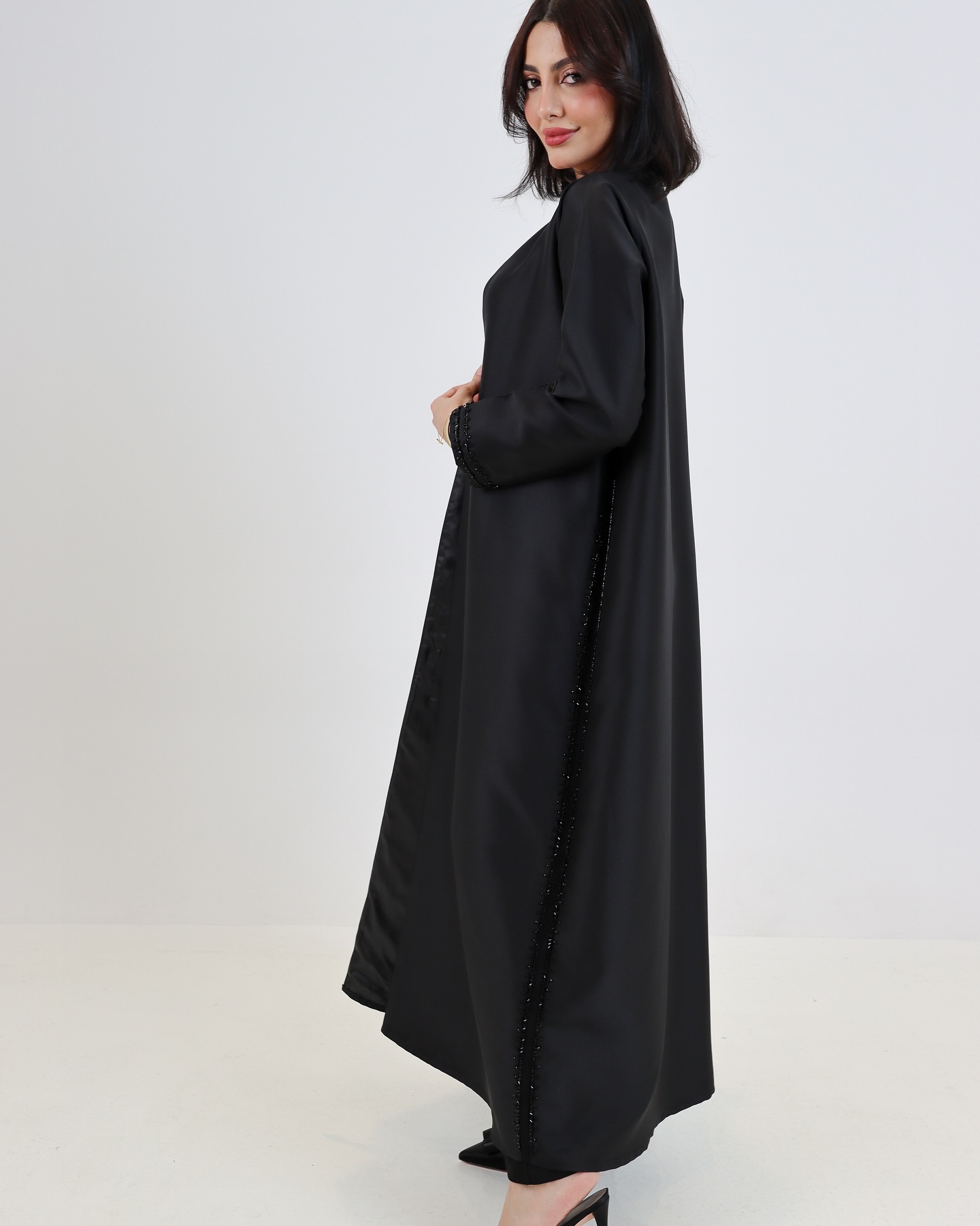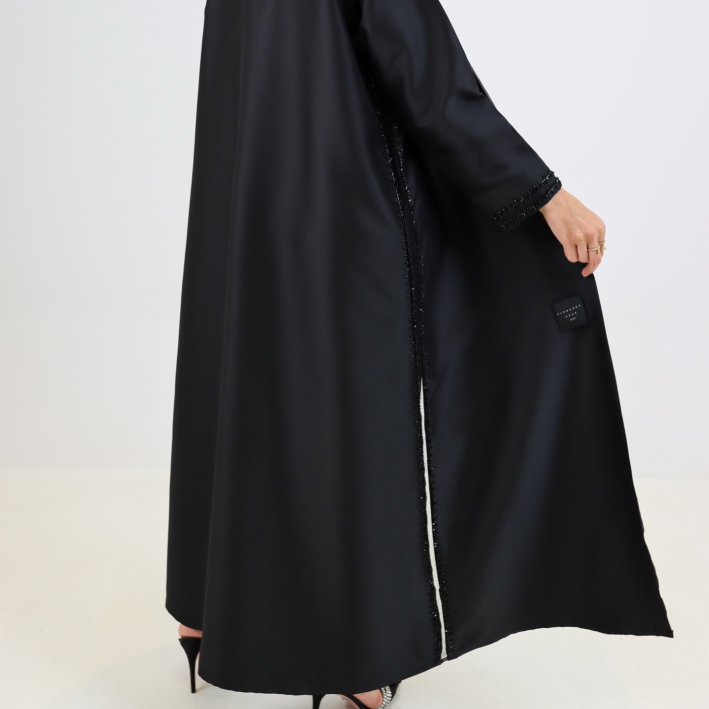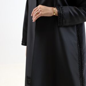 عباية H04 من Elegance Heus… تصميم أسود كلاسيكي مزين بتطريز ناعم من الخرز الأسود على الأكمام والحواف، يضفي لمسة فخمة وراقية. مثالية للإطلالات الرسمية والمناسبات الهادئة، بتفاصيل بسيطة وأنيقة.