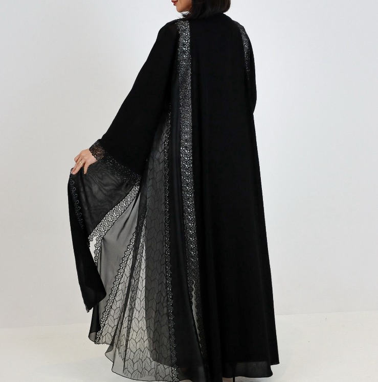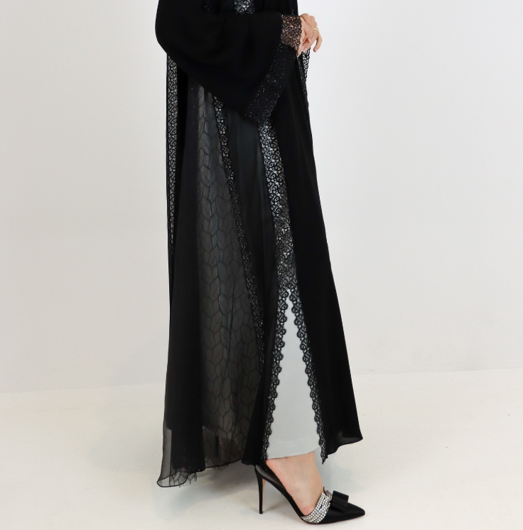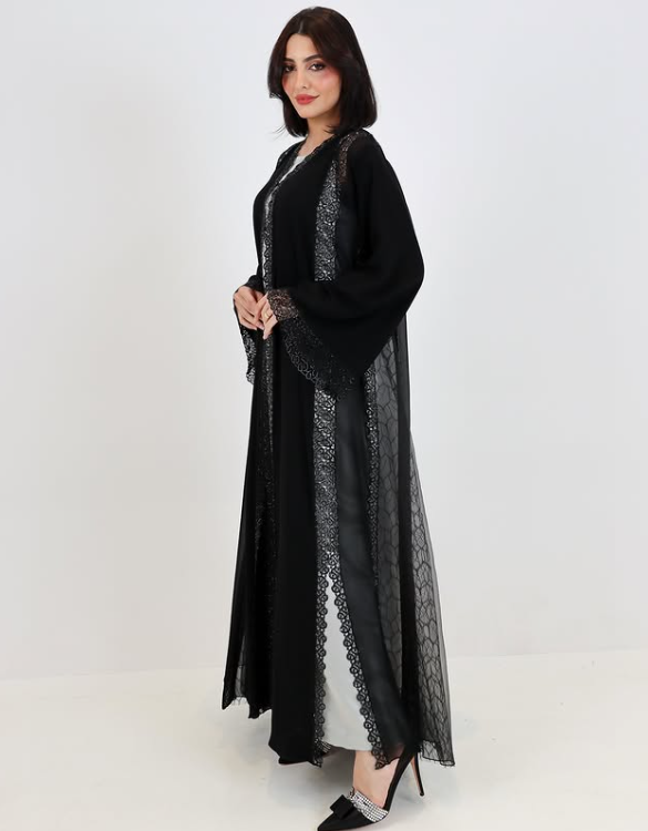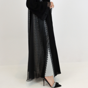 تصميم فاخر يجمع بين القماش الأسود والدانتيل الشفاف المطرز على الجانبين والأكمام بلمسة أنثوية ناعمة. مثالية لإطلالة راقية في المناسبات أو المساء.