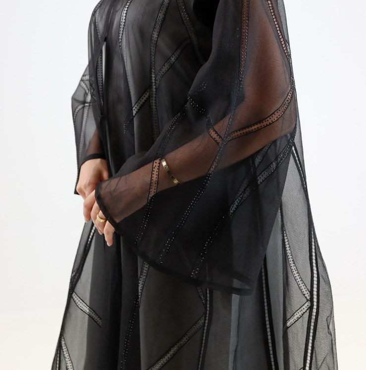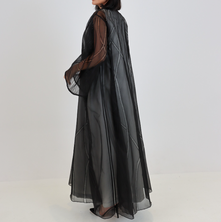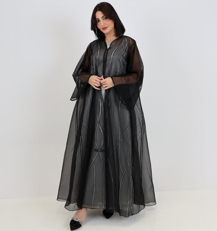 تصميم شفاف أنيق من الشيفون الأسود مزين بخطوط لامعة متعرّجة تضيف لمسة عصرية وجذابة. مثالية للسهرات والإطلالات المسائية الراقية.