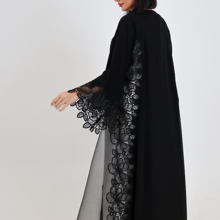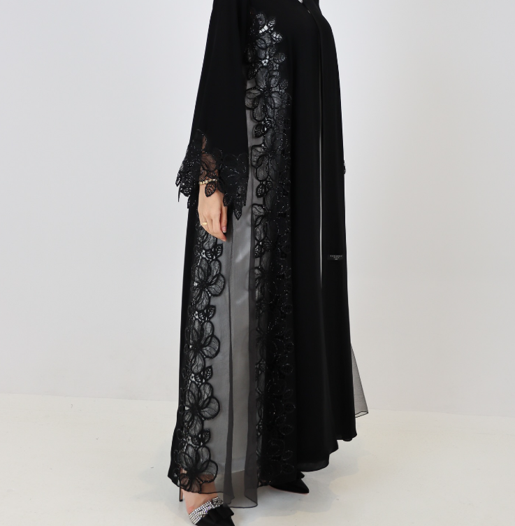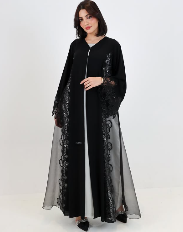 عباية راقية بتصميم شفاف من الشيفون الأسود مزينة بتطريزات وردية فاخرة على الأطراف والأكمام. لمسة أنثوية ناعمة مثالية للمناسبات الخاصة والإطلالات المميزة.